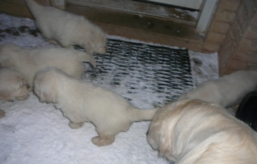 The puppies got their first experience in the snow while their pen was cleaned....not